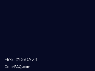 Hex #060a24 Color is a almost black blue color and the nearest color is Deep Ebony #0c0b1d. Hex code #060a24 and RGB value is rgb(6,10,36). In RGB color space, this color is composed of 2% red, 4% green, 14% blue, In CMYK color space, this color is composed of 83% cyan, 72% magenta, 0% yellow , 86% black , In HSL color space, this color has a hue angle of 232° , 71% saturation and 8% lightness.