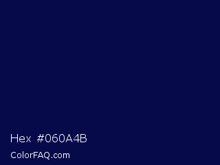 Hex #060a4b Color is a very dark blue color and the nearest color is Stratos #000741. Hex code #060a4b and RGB value is rgb(6,10,75). In RGB color space, this color is composed of 2% red, 4% green, 29% blue, In CMYK color space, this color is composed of 92% cyan, 87% magenta, 0% yellow , 71% black , In HSL color space, this color has a hue angle of 237° , 85% saturation and 16% lightness.