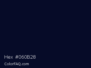 Hex #060b28 Color is a almost black blue color and the nearest color is Black Pearl #041322. Hex code #060b28 and RGB value is rgb(6,11,40). In RGB color space, this color is composed of 2% red, 4% green, 16% blue, In CMYK color space, this color is composed of 85% cyan, 73% magenta, 0% yellow , 84% black , In HSL color space, this color has a hue angle of 231° , 74% saturation and 9% lightness.