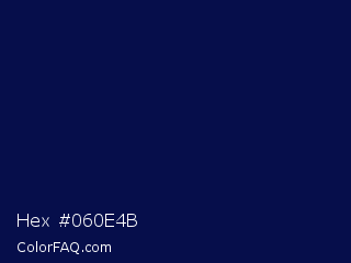 Hex #060e4b Color is a very dark blue color and the nearest color is Deep Cove #051040. Hex code #060e4b and RGB value is rgb(6,14,75). In RGB color space, this color is composed of 2% red, 5% green, 29% blue, In CMYK color space, this color is composed of 92% cyan, 81% magenta, 0% yellow , 71% black , In HSL color space, this color has a hue angle of 233° , 85% saturation and 16% lightness.