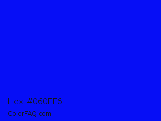 Hex #060ef6 Color is a normal blue color and the nearest color is Blue #0000ff. Hex code #060ef6 and RGB value is rgb(6,14,246). In RGB color space, this color is composed of 2% red, 5% green, 96% blue, In CMYK color space, this color is composed of 98% cyan, 94% magenta, 0% yellow , 4% black , In HSL color space, this color has a hue angle of 238° , 95% saturation and 49% lightness.