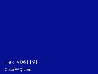 Hex #061191 Color is a dark blue color and the nearest color is Phthalo Blue #000f89. Hex code #061191 and RGB value is rgb(6,17,145). In RGB color space, this color is composed of 2% red, 7% green, 57% blue, In CMYK color space, this color is composed of 96% cyan, 88% magenta, 0% yellow , 43% black , In HSL color space, this color has a hue angle of 235° , 92% saturation and 30% lightness.