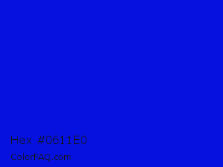 Hex #0611e0 Color is a normal blue color and the nearest color is Medium Blue #0000cd. Hex code #0611e0 and RGB value is rgb(6,17,224). In RGB color space, this color is composed of 2% red, 7% green, 88% blue, In CMYK color space, this color is composed of 97% cyan, 92% magenta, 0% yellow , 12% black , In HSL color space, this color has a hue angle of 237° , 95% saturation and 45% lightness.