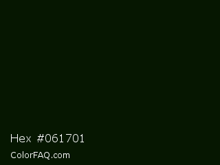 Hex #061701 Color is a almost black green color and the nearest color is Black Forest #0b1304. Hex code #061701 and RGB value is rgb(6,23,1). In RGB color space, this color is composed of 2% red, 9% green, 0% blue, In CMYK color space, this color is composed of 74% cyan, 0% magenta, 96% yellow , 91% black , In HSL color space, this color has a hue angle of 106° , 92% saturation and 5% lightness.