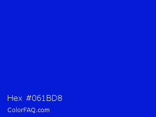 Hex #061bd8 Color is a normal blue color and the nearest color is Medium Blue #0000cd. Hex code #061bd8 and RGB value is rgb(6,27,216). In RGB color space, this color is composed of 2% red, 11% green, 85% blue, In CMYK color space, this color is composed of 97% cyan, 88% magenta, 0% yellow , 15% black , In HSL color space, this color has a hue angle of 234° , 95% saturation and 44% lightness.