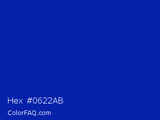 Hex #0622ab Color is a normal blue color and the nearest color is Blue Pantone #0018a8. Hex code #0622ab and RGB value is rgb(6,34,171). In RGB color space, this color is composed of 2% red, 13% green, 67% blue, In CMYK color space, this color is composed of 96% cyan, 80% magenta, 0% yellow , 33% black , In HSL color space, this color has a hue angle of 230° , 93% saturation and 35% lightness.