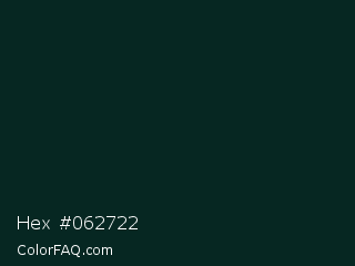 Hex #062722 Color is a almost black cyan color and the nearest color is Burnham #002e20. Hex code #062722 and RGB value is rgb(6,39,34). In RGB color space, this color is composed of 2% red, 15% green, 13% blue, In CMYK color space, this color is composed of 85% cyan, 0% magenta, 13% yellow , 85% black , In HSL color space, this color has a hue angle of 171° , 73% saturation and 9% lightness.