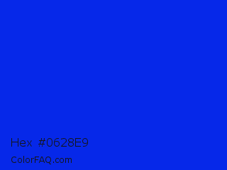 Hex #0628e9 Color is a normal blue color and the nearest color is Bluebonnet #1c1cf0. Hex code #0628e9 and RGB value is rgb(6,40,233). In RGB color space, this color is composed of 2% red, 16% green, 91% blue, In CMYK color space, this color is composed of 97% cyan, 83% magenta, 0% yellow , 9% black , In HSL color space, this color has a hue angle of 231° , 95% saturation and 47% lightness.