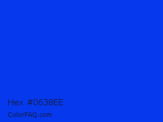 Hex #0638ee Color is a normal blue color and the nearest color is Blue RYB #0247fe. Hex code #0638ee and RGB value is rgb(6,56,238). In RGB color space, this color is composed of 2% red, 22% green, 93% blue, In CMYK color space, this color is composed of 97% cyan, 76% magenta, 0% yellow , 7% black , In HSL color space, this color has a hue angle of 227° , 95% saturation and 48% lightness.