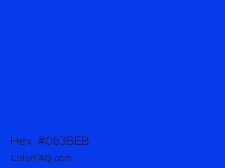 Hex #063beb Color is a normal blue color and the nearest color is Blue RYB #0247fe. Hex code #063beb and RGB value is rgb(6,59,235). In RGB color space, this color is composed of 2% red, 23% green, 92% blue, In CMYK color space, this color is composed of 97% cyan, 75% magenta, 0% yellow , 8% black , In HSL color space, this color has a hue angle of 226° , 95% saturation and 47% lightness.