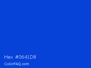 Hex #0641d8 Color is a normal blue color and the nearest color is Absolute Zero #0048ba. Hex code #0641d8 and RGB value is rgb(6,65,216). In RGB color space, this color is composed of 2% red, 25% green, 85% blue, In CMYK color space, this color is composed of 97% cyan, 70% magenta, 0% yellow , 15% black , In HSL color space, this color has a hue angle of 223° , 95% saturation and 44% lightness.