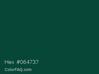 Hex #064737 Color is a very dark cyan color and the nearest color is Rich Black #004040. Hex code #064737 and RGB value is rgb(6,71,55). In RGB color space, this color is composed of 2% red, 28% green, 22% blue, In CMYK color space, this color is composed of 92% cyan, 0% magenta, 23% yellow , 72% black , In HSL color space, this color has a hue angle of 165° , 84% saturation and 15% lightness.