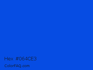 Hex #064ce3 Color is a normal blue color and the nearest color is Blue RYB #0247fe. Hex code #064ce3 and RGB value is rgb(6,76,227). In RGB color space, this color is composed of 2% red, 30% green, 89% blue, In CMYK color space, this color is composed of 97% cyan, 67% magenta, 0% yellow , 11% black , In HSL color space, this color has a hue angle of 221° , 95% saturation and 46% lightness.