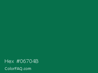 Hex #06704b Color is a dark green color and the nearest color is Bottle Green #006a4e. Hex code #06704b and RGB value is rgb(6,112,75). In RGB color space, this color is composed of 2% red, 44% green, 29% blue, In CMYK color space, this color is composed of 95% cyan, 0% magenta, 33% yellow , 56% black , In HSL color space, this color has a hue angle of 159° , 90% saturation and 23% lightness.