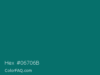 Hex #06706b Color is a dark cyan color and the nearest color is Mosque #036a6e. Hex code #06706b and RGB value is rgb(6,112,107). In RGB color space, this color is composed of 2% red, 44% green, 42% blue, In CMYK color space, this color is composed of 95% cyan, 0% magenta, 4% yellow , 56% black , In HSL color space, this color has a hue angle of 177° , 90% saturation and 23% lightness.