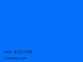 Hex #0670fb Color is a normal blue color and the nearest color is Brandeis Blue #0070ff. Hex code #0670fb and RGB value is rgb(6,112,251). In RGB color space, this color is composed of 2% red, 44% green, 98% blue, In CMYK color space, this color is composed of 98% cyan, 55% magenta, 0% yellow , 2% black , In HSL color space, this color has a hue angle of 214° , 97% saturation and 50% lightness.