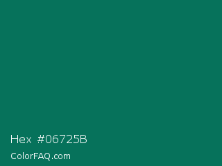 Hex #06725b Color is a dark cyan color and the nearest color is Watercourse #056f57. Hex code #06725b and RGB value is rgb(6,114,91). In RGB color space, this color is composed of 2% red, 45% green, 36% blue, In CMYK color space, this color is composed of 95% cyan, 0% magenta, 20% yellow , 55% black , In HSL color space, this color has a hue angle of 167° , 90% saturation and 24% lightness.
