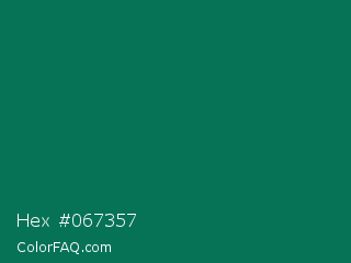 Hex #067357 Color is a dark cyan color and the nearest color is Watercourse #056f57. Hex code #067357 and RGB value is rgb(6,115,87). In RGB color space, this color is composed of 2% red, 45% green, 34% blue, In CMYK color space, this color is composed of 95% cyan, 0% magenta, 24% yellow , 55% black , In HSL color space, this color has a hue angle of 165° , 90% saturation and 24% lightness.