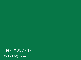 Hex #067747 Color is a dark green color and the nearest color is Salem #097f4b. Hex code #067747 and RGB value is rgb(6,119,71). In RGB color space, this color is composed of 2% red, 47% green, 28% blue, In CMYK color space, this color is composed of 95% cyan, 0% magenta, 40% yellow , 53% black , In HSL color space, this color has a hue angle of 155° , 90% saturation and 25% lightness.