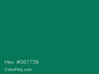 Hex #067758 Color is a dark cyan color and the nearest color is Watercourse #056f57. Hex code #067758 and RGB value is rgb(6,119,88). In RGB color space, this color is composed of 2% red, 47% green, 35% blue, In CMYK color space, this color is composed of 95% cyan, 0% magenta, 26% yellow , 53% black , In HSL color space, this color has a hue angle of 164° , 90% saturation and 25% lightness.