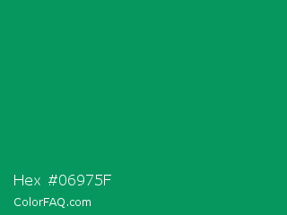 Hex #06975f Color is a normal green color and the nearest color is Shamrock Green #009e60. Hex code #06975f and RGB value is rgb(6,151,95). In RGB color space, this color is composed of 2% red, 59% green, 37% blue, In CMYK color space, this color is composed of 96% cyan, 0% magenta, 37% yellow , 41% black , In HSL color space, this color has a hue angle of 157° , 92% saturation and 31% lightness.