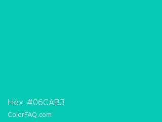 Hex #06cab3 Color is a normal cyan color and the nearest color is Amazonite #00c4b0. Hex code #06cab3 and RGB value is rgb(6,202,179). In RGB color space, this color is composed of 2% red, 79% green, 70% blue, In CMYK color space, this color is composed of 97% cyan, 0% magenta, 11% yellow , 21% black , In HSL color space, this color has a hue angle of 173° , 94% saturation and 41% lightness.