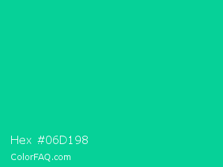 Hex #06d198 Color is a normal green color and the nearest color is Caribbean Green #00cc99. Hex code #06d198 and RGB value is rgb(6,209,152). In RGB color space, this color is composed of 2% red, 82% green, 60% blue, In CMYK color space, this color is composed of 97% cyan, 0% magenta, 27% yellow , 18% black , In HSL color space, this color has a hue angle of 163° , 94% saturation and 42% lightness.