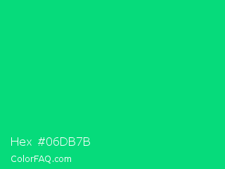 Hex #06db7b Color is a normal green color and the nearest color is Caribbean Green #00cc99. Hex code #06db7b and RGB value is rgb(6,219,123). In RGB color space, this color is composed of 2% red, 86% green, 48% blue, In CMYK color space, this color is composed of 97% cyan, 0% magenta, 44% yellow , 14% black , In HSL color space, this color has a hue angle of 153° , 95% saturation and 44% lightness.