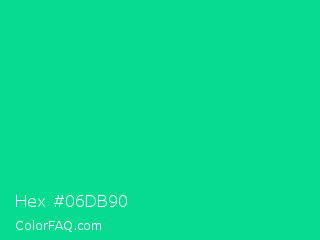 Hex #06db90 Color is a normal green color and the nearest color is Caribbean Green #00cc99. Hex code #06db90 and RGB value is rgb(6,219,144). In RGB color space, this color is composed of 2% red, 86% green, 56% blue, In CMYK color space, this color is composed of 97% cyan, 0% magenta, 34% yellow , 14% black , In HSL color space, this color has a hue angle of 159° , 95% saturation and 44% lightness.