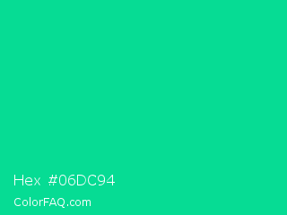 Hex #06dc94 Color is a normal green color and the nearest color is Caribbean Green #00cc99. Hex code #06dc94 and RGB value is rgb(6,220,148). In RGB color space, this color is composed of 2% red, 86% green, 58% blue, In CMYK color space, this color is composed of 97% cyan, 0% magenta, 33% yellow , 14% black , In HSL color space, this color has a hue angle of 160° , 95% saturation and 44% lightness.