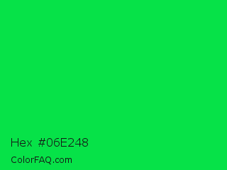 Hex #06e248 Color is a normal green color and the nearest color is Malachite #0bda51. Hex code #06e248 and RGB value is rgb(6,226,72). In RGB color space, this color is composed of 2% red, 89% green, 28% blue, In CMYK color space, this color is composed of 97% cyan, 0% magenta, 68% yellow , 11% black , In HSL color space, this color has a hue angle of 138° , 95% saturation and 45% lightness.
