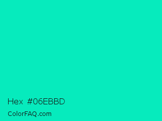 Hex #06ebbd Color is a normal cyan color and the nearest color is Bright Turquoise #08e8de. Hex code #06ebbd and RGB value is rgb(6,235,189). In RGB color space, this color is composed of 2% red, 92% green, 74% blue, In CMYK color space, this color is composed of 97% cyan, 0% magenta, 20% yellow , 8% black , In HSL color space, this color has a hue angle of 168° , 95% saturation and 47% lightness.