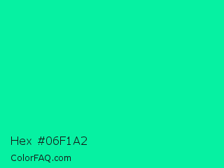 Hex #06f1a2 Color is a normal green color and the nearest color is Medium Spring Green #00fa9a. Hex code #06f1a2 and RGB value is rgb(6,241,162). In RGB color space, this color is composed of 2% red, 95% green, 64% blue, In CMYK color space, this color is composed of 98% cyan, 0% magenta, 33% yellow , 5% black , In HSL color space, this color has a hue angle of 160° , 95% saturation and 48% lightness.