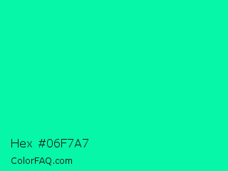 Hex #06f7a7 Color is a normal green color and the nearest color is Medium Spring Green #00fa9a. Hex code #06f7a7 and RGB value is rgb(6,247,167). In RGB color space, this color is composed of 2% red, 97% green, 65% blue, In CMYK color space, this color is composed of 98% cyan, 0% magenta, 32% yellow , 3% black , In HSL color space, this color has a hue angle of 160° , 95% saturation and 50% lightness.