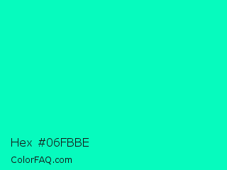 Hex #06fbbe Color is a normal cyan color and the nearest color is Medium Spring Green #00fa9a. Hex code #06fbbe and RGB value is rgb(6,251,190). In RGB color space, this color is composed of 2% red, 98% green, 75% blue, In CMYK color space, this color is composed of 98% cyan, 0% magenta, 24% yellow , 2% black , In HSL color space, this color has a hue angle of 165° , 97% saturation and 50% lightness.