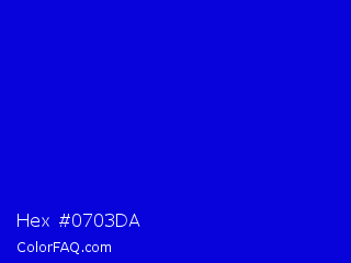 Hex #0703da Color is a normal indigo color and the nearest color is Medium Blue #0000cd. Hex code #0703da and RGB value is rgb(7,3,218). In RGB color space, this color is composed of 3% red, 1% green, 85% blue, In CMYK color space, this color is composed of 97% cyan, 99% magenta, 0% yellow , 15% black , In HSL color space, this color has a hue angle of 241° , 97% saturation and 43% lightness.