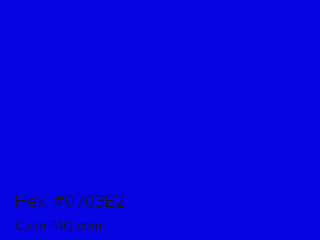 Hex #0703e2 Color is a normal indigo color and the nearest color is Medium Blue #0000cd. Hex code #0703e2 and RGB value is rgb(7,3,226). In RGB color space, this color is composed of 3% red, 1% green, 89% blue, In CMYK color space, this color is composed of 97% cyan, 99% magenta, 0% yellow , 11% black , In HSL color space, this color has a hue angle of 241° , 97% saturation and 45% lightness.