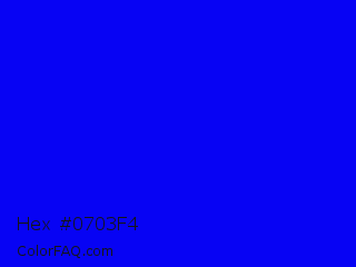 Hex #0703f4 Color is a normal indigo color and the nearest color is Blue #0000ff. Hex code #0703f4 and RGB value is rgb(7,3,244). In RGB color space, this color is composed of 3% red, 1% green, 96% blue, In CMYK color space, this color is composed of 97% cyan, 99% magenta, 0% yellow , 4% black , In HSL color space, this color has a hue angle of 241° , 98% saturation and 48% lightness.