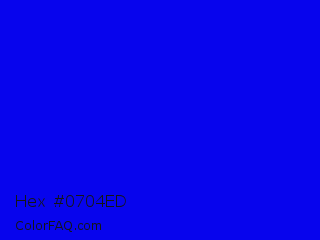 Hex #0704ed Color is a normal indigo color and the nearest color is Blue #0000ff. Hex code #0704ed and RGB value is rgb(7,4,237). In RGB color space, this color is composed of 3% red, 2% green, 93% blue, In CMYK color space, this color is composed of 97% cyan, 98% magenta, 0% yellow , 7% black , In HSL color space, this color has a hue angle of 241° , 97% saturation and 47% lightness.
