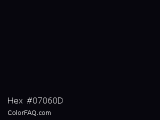 Hex #07060d Color is a almost black indigo color and the nearest color is Jaguar #080110. Hex code #07060d and RGB value is rgb(7,6,13). In RGB color space, this color is composed of 3% red, 2% green, 5% blue, In CMYK color space, this color is composed of 46% cyan, 54% magenta, 0% yellow , 95% black , In HSL color space, this color has a hue angle of 249° , 37% saturation and 4% lightness.