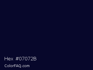 Hex #07072b Color is a very dark blue color and the nearest color is Black Rock #0d0332. Hex code #07072b and RGB value is rgb(7,7,43). In RGB color space, this color is composed of 3% red, 3% green, 17% blue, In CMYK color space, this color is composed of 84% cyan, 84% magenta, 0% yellow , 83% black , In HSL color space, this color has a hue angle of 240° , 72% saturation and 10% lightness.