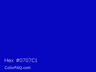 Hex #0707c1 Color is a normal blue color and the nearest color is Dark Blue #0000c8. Hex code #0707c1 and RGB value is rgb(7,7,193). In RGB color space, this color is composed of 3% red, 3% green, 76% blue, In CMYK color space, this color is composed of 96% cyan, 96% magenta, 0% yellow , 24% black , In HSL color space, this color has a hue angle of 240° , 93% saturation and 39% lightness.