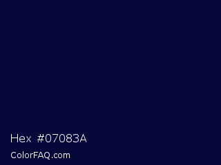 Hex #07083a Color is a very dark blue color and the nearest color is Stratos #000741. Hex code #07083a and RGB value is rgb(7,8,58). In RGB color space, this color is composed of 3% red, 3% green, 23% blue, In CMYK color space, this color is composed of 88% cyan, 86% magenta, 0% yellow , 77% black , In HSL color space, this color has a hue angle of 239° , 78% saturation and 13% lightness.