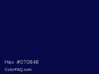 Hex #070848 Color is a very dark blue color and the nearest color is Stratos #000741. Hex code #070848 and RGB value is rgb(7,8,72). In RGB color space, this color is composed of 3% red, 3% green, 28% blue, In CMYK color space, this color is composed of 90% cyan, 89% magenta, 0% yellow , 72% black , In HSL color space, this color has a hue angle of 239° , 82% saturation and 15% lightness.