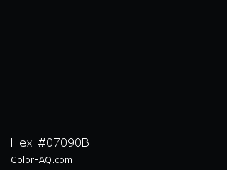 Hex #07090b Color is a almost black blue color and the nearest color is Cod Gray #0b0b0b. Hex code #07090b and RGB value is rgb(7,9,11). In RGB color space, this color is composed of 3% red, 4% green, 4% blue, In CMYK color space, this color is composed of 36% cyan, 18% magenta, 0% yellow , 96% black , In HSL color space, this color has a hue angle of 210° , 22% saturation and 4% lightness.