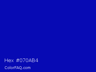 Hex #070ab4 Color is a normal blue color and the nearest color is Zaffre #0014a8. Hex code #070ab4 and RGB value is rgb(7,10,180). In RGB color space, this color is composed of 3% red, 4% green, 71% blue, In CMYK color space, this color is composed of 96% cyan, 94% magenta, 0% yellow , 29% black , In HSL color space, this color has a hue angle of 239° , 93% saturation and 37% lightness.