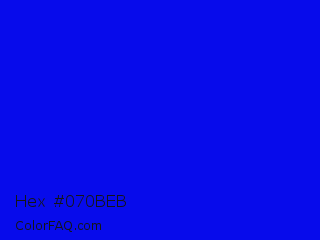 Hex #070beb Color is a normal blue color and the nearest color is Blue #0000ff. Hex code #070beb and RGB value is rgb(7,11,235). In RGB color space, this color is composed of 3% red, 4% green, 92% blue, In CMYK color space, this color is composed of 97% cyan, 95% magenta, 0% yellow , 8% black , In HSL color space, this color has a hue angle of 239° , 94% saturation and 47% lightness.