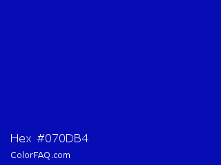 Hex #070db4 Color is a normal blue color and the nearest color is Zaffre #0014a8. Hex code #070db4 and RGB value is rgb(7,13,180). In RGB color space, this color is composed of 3% red, 5% green, 71% blue, In CMYK color space, this color is composed of 96% cyan, 93% magenta, 0% yellow , 29% black , In HSL color space, this color has a hue angle of 238° , 93% saturation and 37% lightness.