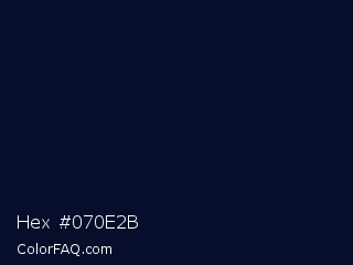 Hex #070e2b Color is a very dark blue color and the nearest color is Black Pearl #041322. Hex code #070e2b and RGB value is rgb(7,14,43). In RGB color space, this color is composed of 3% red, 5% green, 17% blue, In CMYK color space, this color is composed of 84% cyan, 67% magenta, 0% yellow , 83% black , In HSL color space, this color has a hue angle of 228° , 72% saturation and 10% lightness.