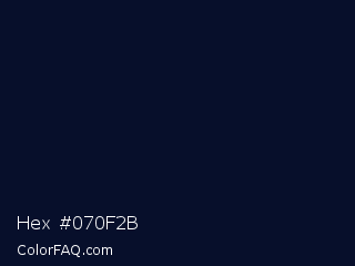 Hex #070f2b Color is a very dark blue color and the nearest color is Black Pearl #041322. Hex code #070f2b and RGB value is rgb(7,15,43). In RGB color space, this color is composed of 3% red, 6% green, 17% blue, In CMYK color space, this color is composed of 84% cyan, 65% magenta, 0% yellow , 83% black , In HSL color space, this color has a hue angle of 227° , 72% saturation and 10% lightness.